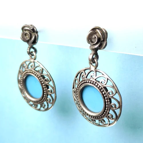 Bring a refreshing pop of color to your jewelry collection with these handcrafted 92.5 pure silver earrings. Featuring a delicate rose-shaped stud, the earrings drop into a circular frame with intricate filigree work, highlighting a striking blue glass center. Their artistic detailing and oxidized finish make them a perfect blend of elegance and charm.