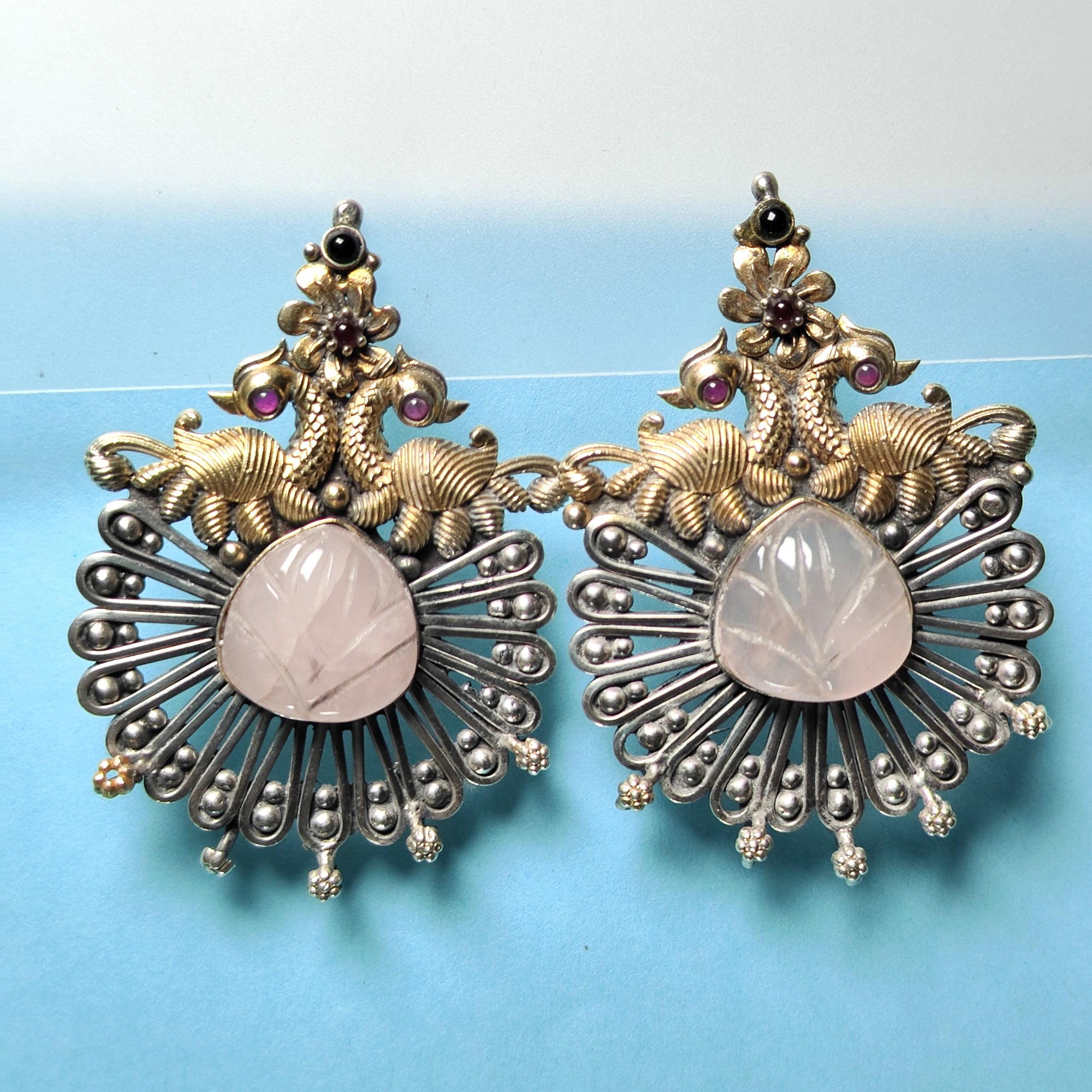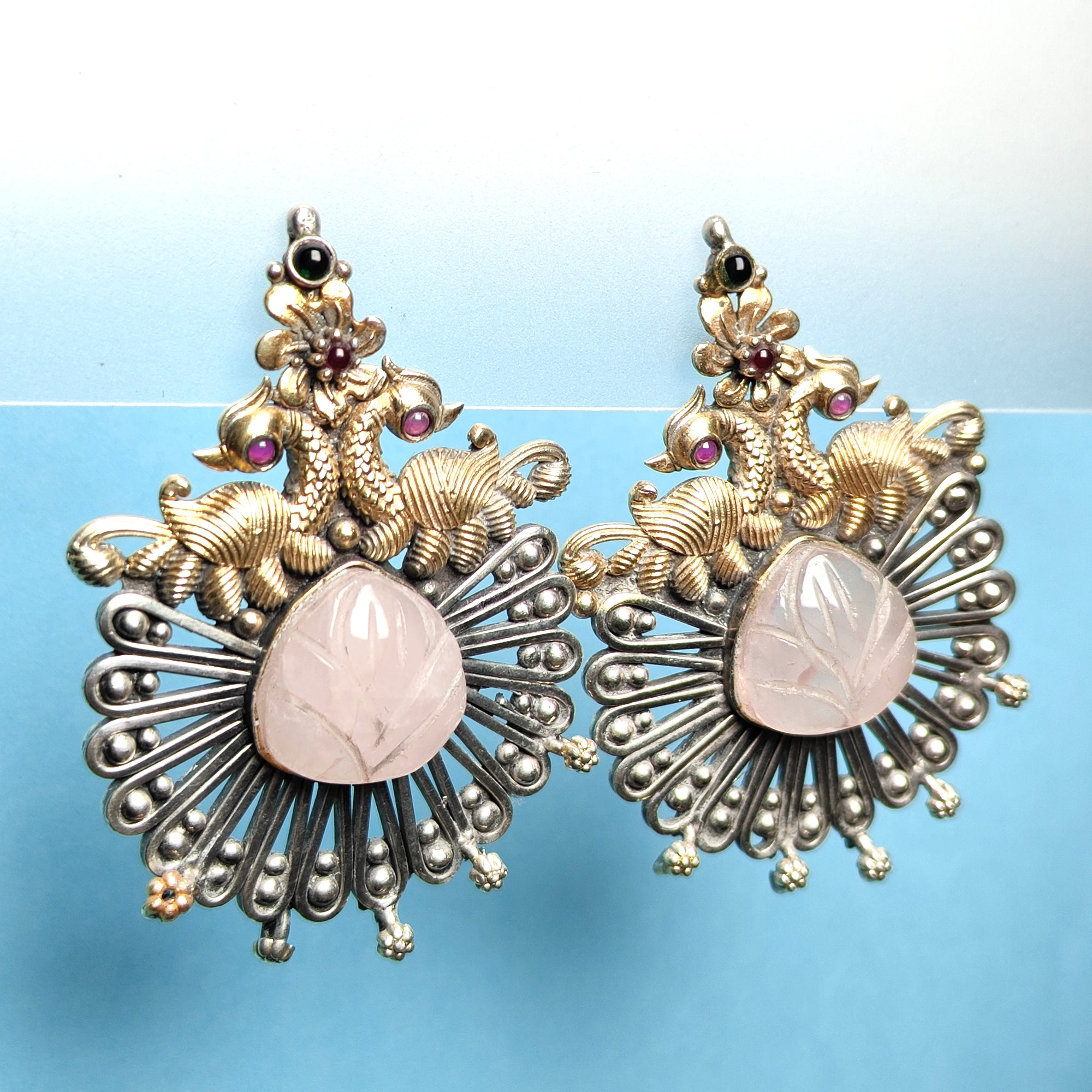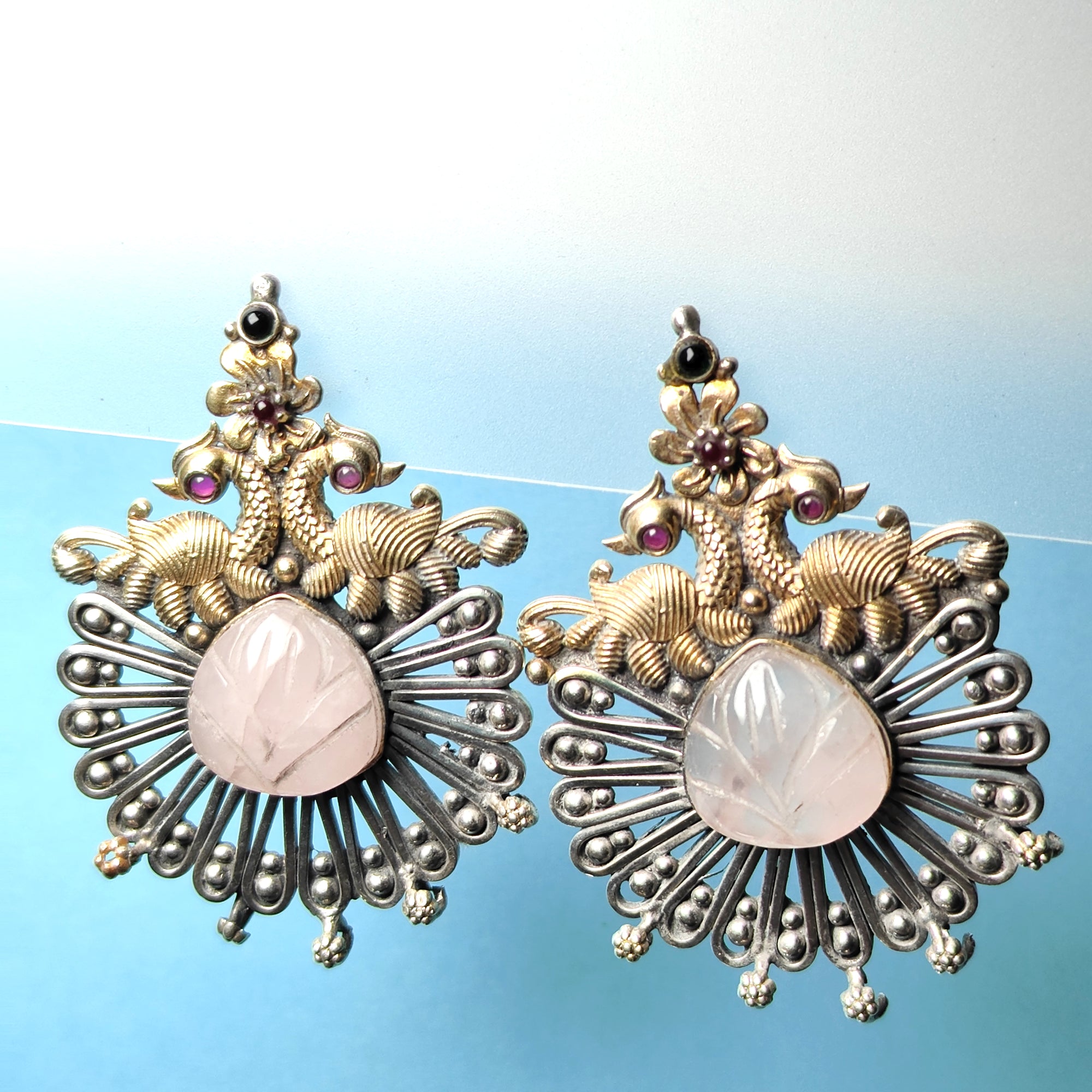 Handcrafted Silver Elephant Motif Earrings with Carved Stone Center