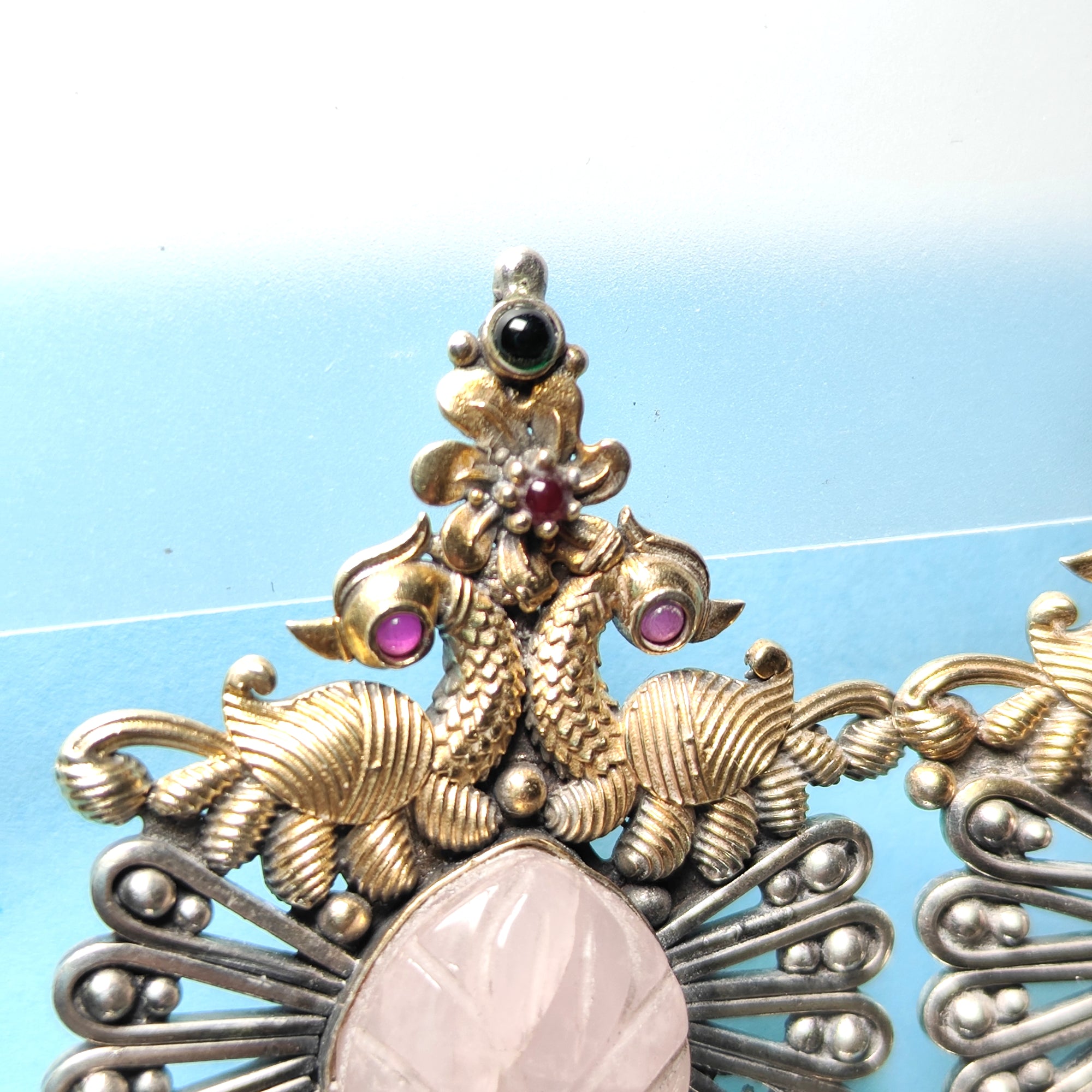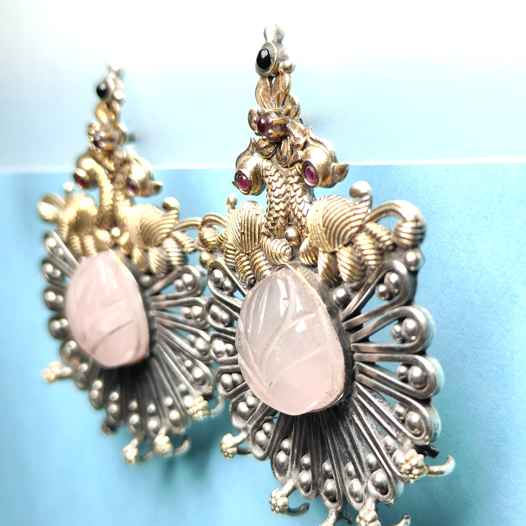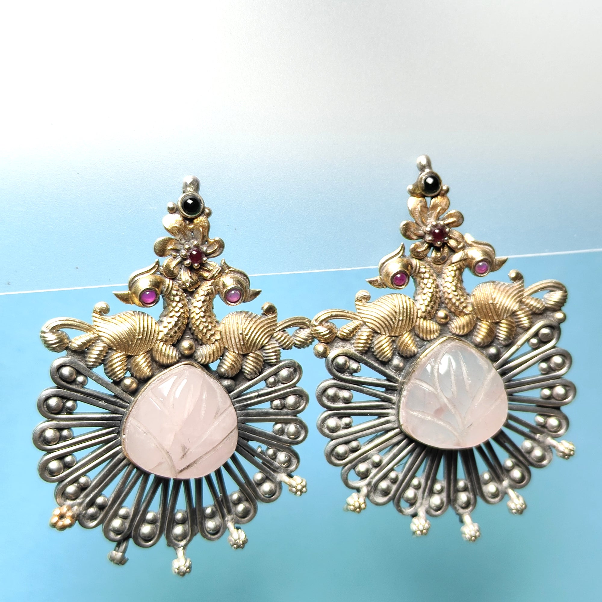 Handcrafted Silver Elephant Motif Earrings with Carved Stone Center