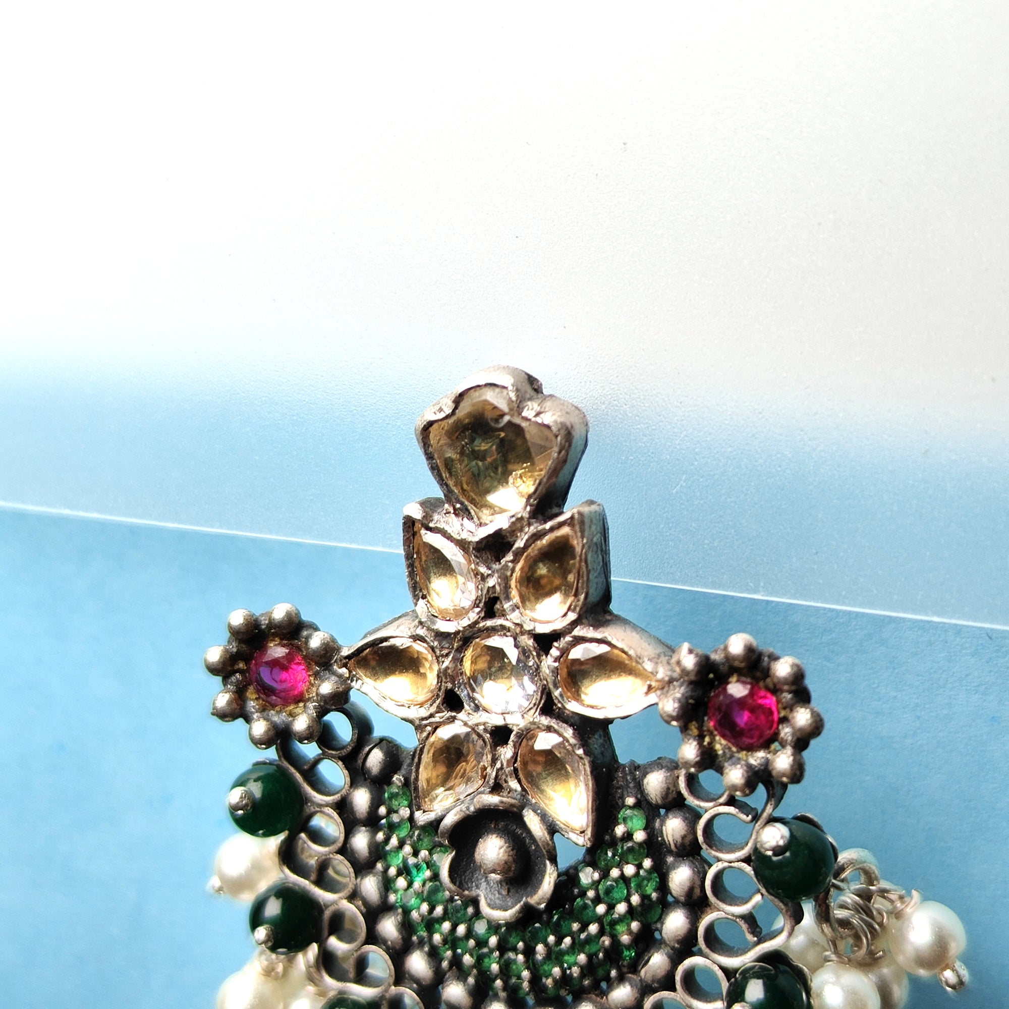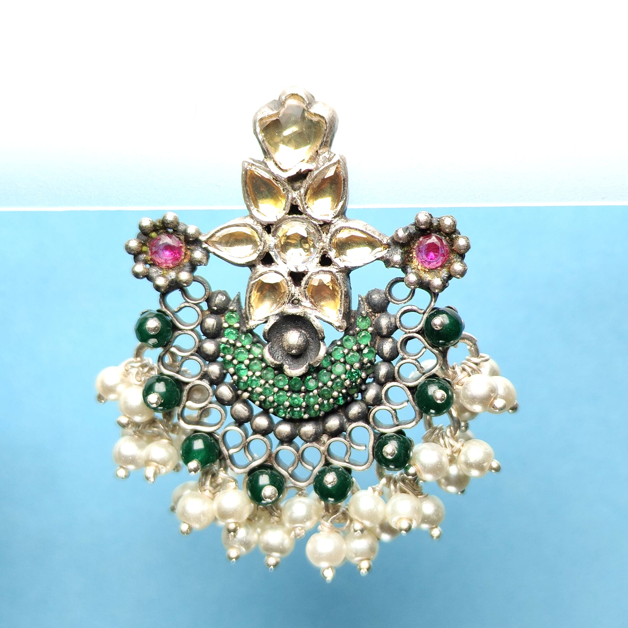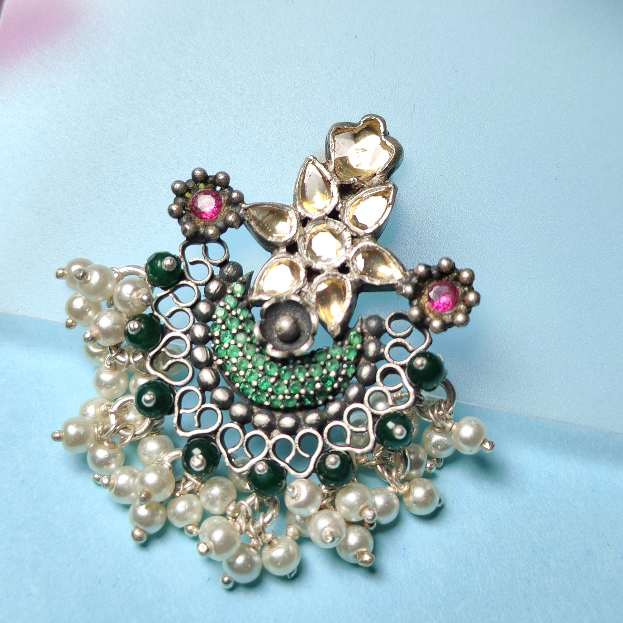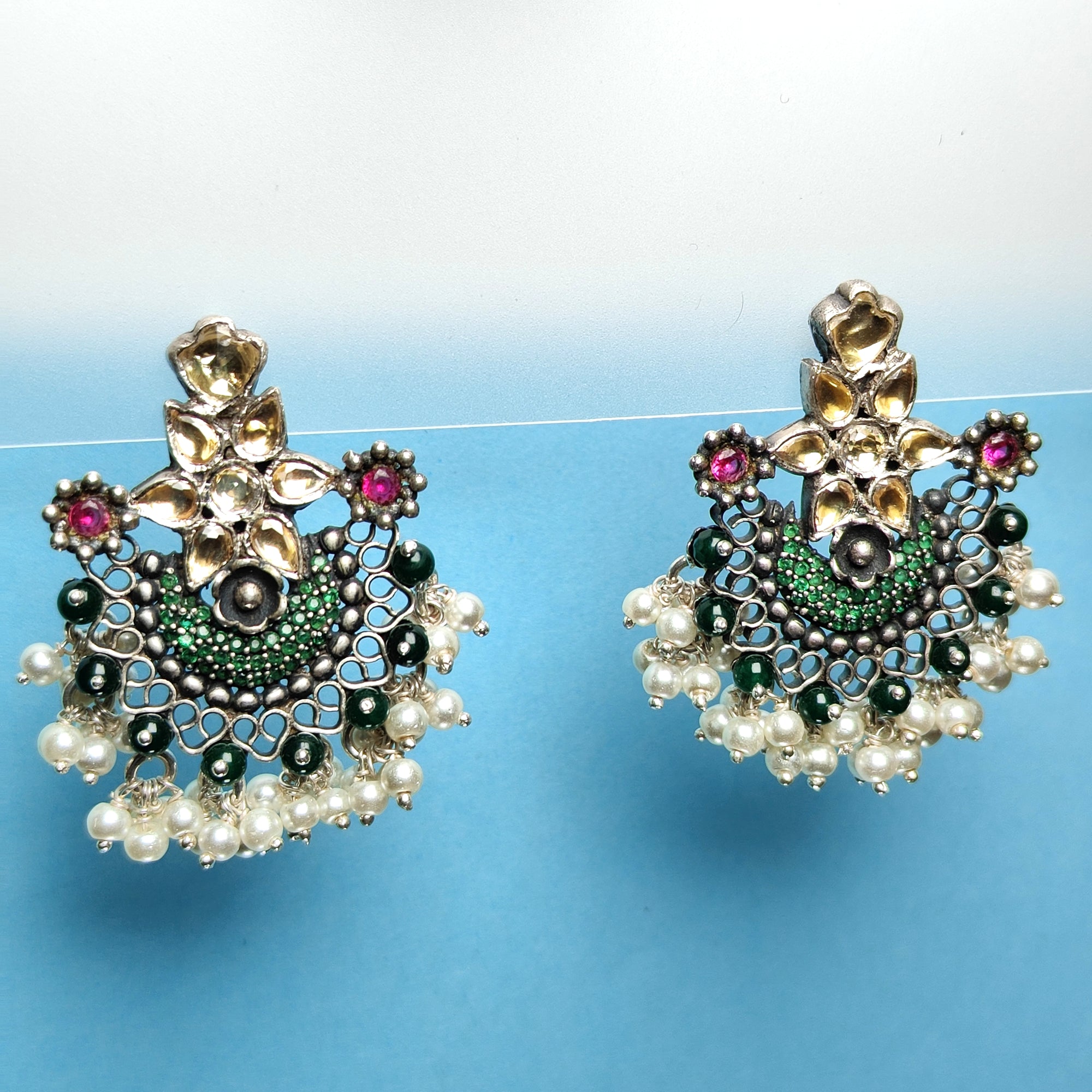 Handcrafted Silver Chandbali Earrings with Kundan, Green Beads & Pearl Drops