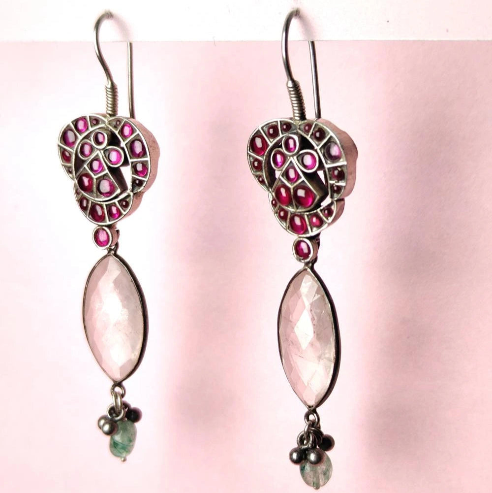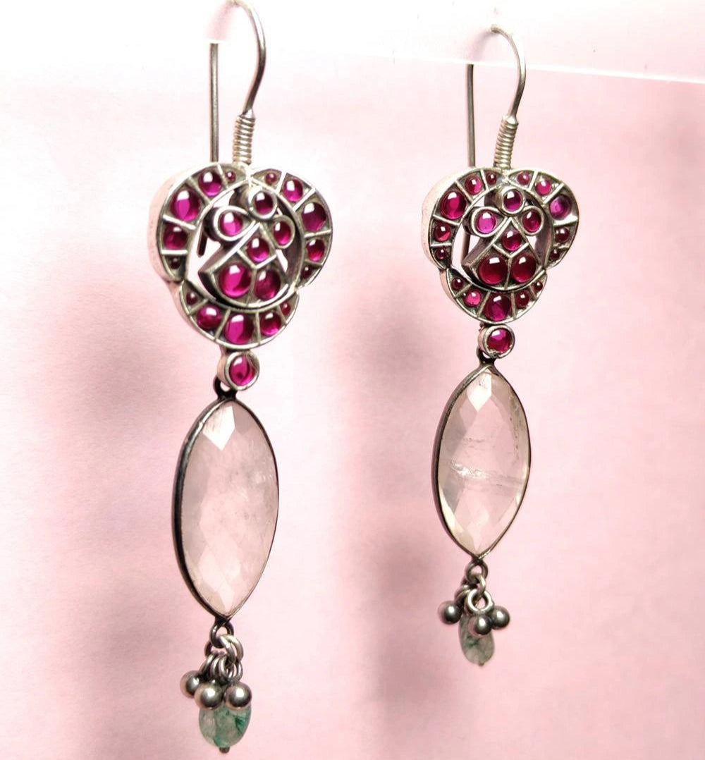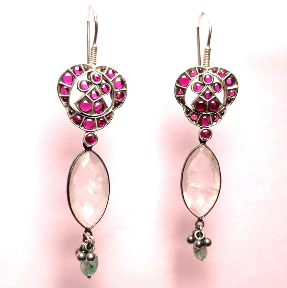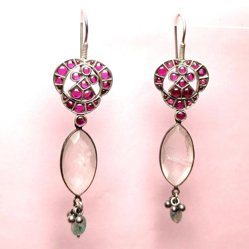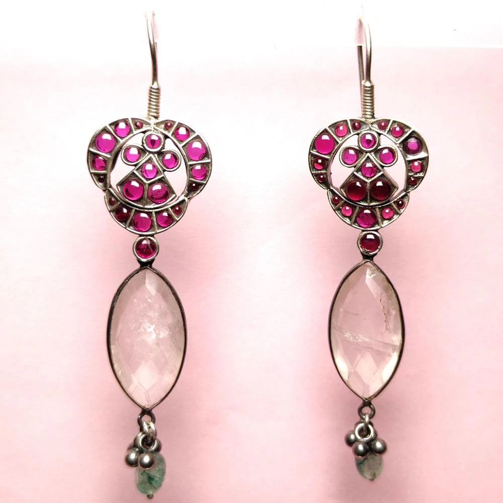 Handcrafted Silver Drop Earrings with Pink Stone and Crystal Accent